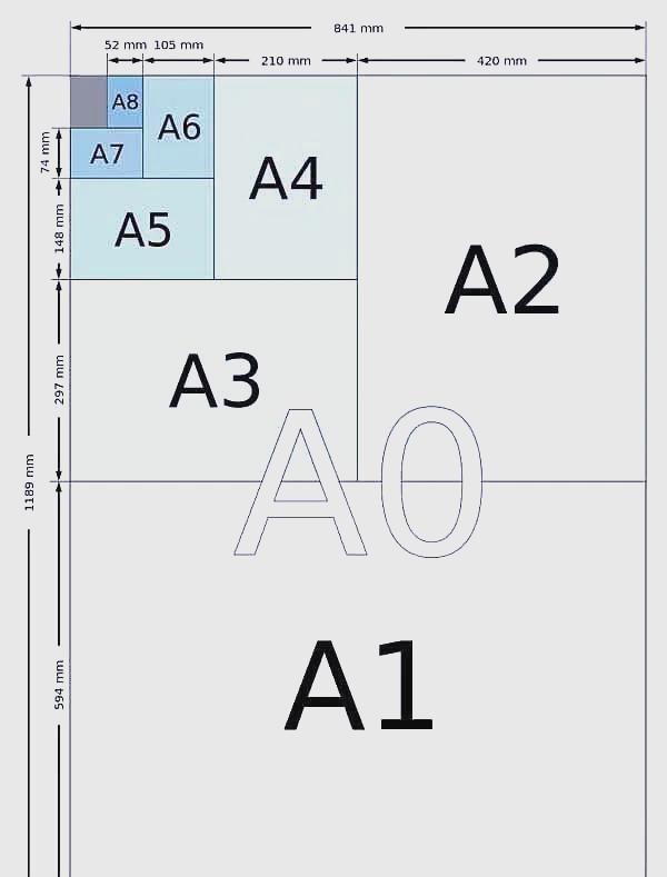 A系列的制定基础首先是求取一张长宽比为1:2的平方根且面积为1平方米(m²)的纸张。因此这张纸的宽长分别为841毫米和1189毫米(长宽比为2的平方根:1),并且编号为A0。若将A0纸张的长边对切为二,则得到两张A1的纸张,其宽长均为594毫米和841 毫米。依此方式继续将A1纸张对切,则可以依序得到A2、A3、A4等等纸张尺寸。在制定标准时,尺寸均以整数为准,因此对切的纸张尺寸若带有小数(小于1 毫米)则会舍入计算。