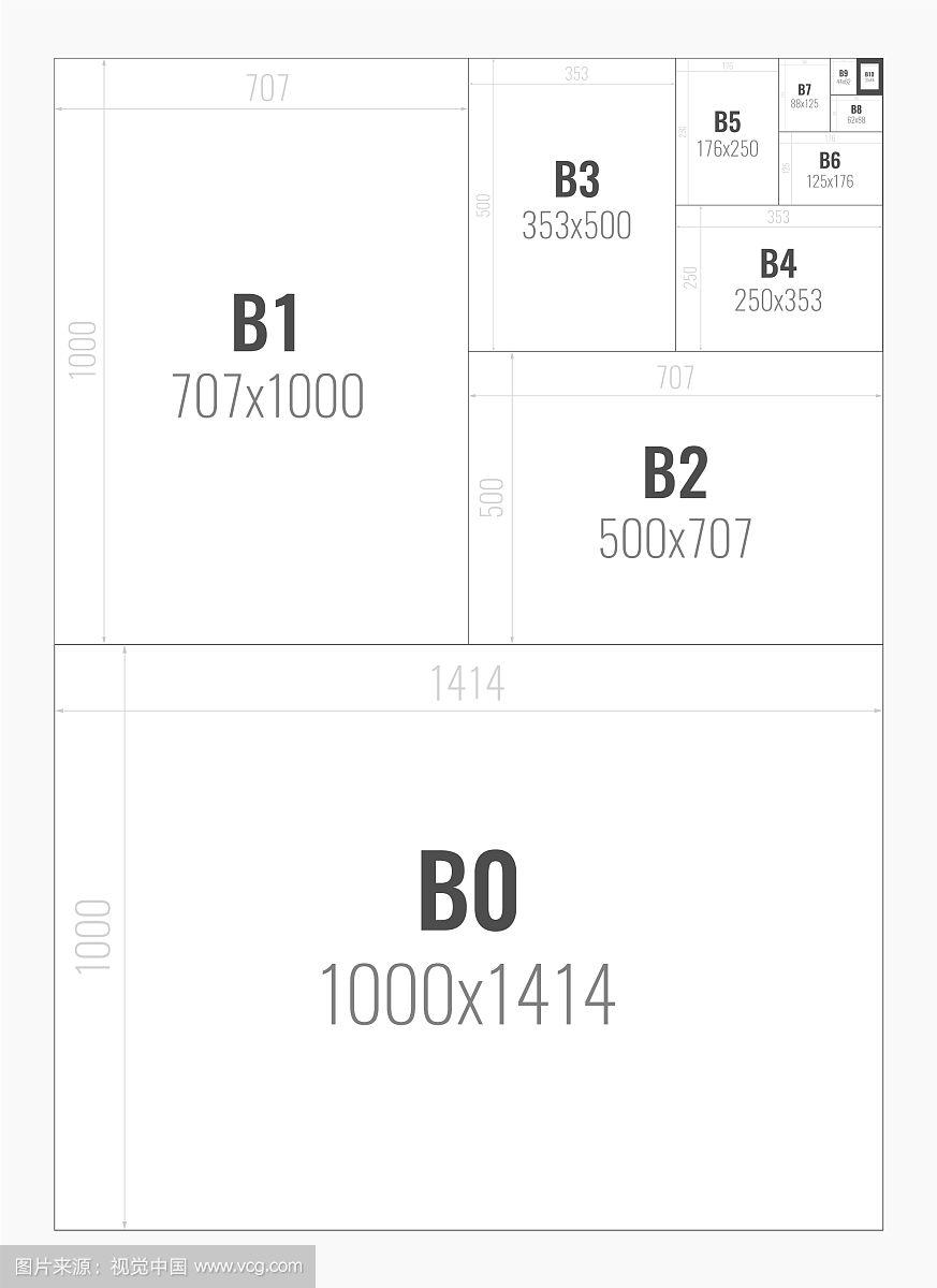 平方米(m²)的纸张。因此这张纸的宽长分别为1000 毫米和1414毫米(长宽比为2的平方根:1),并将其编号为B0。若将B0纸张的长边对切为二,则得到两张B1的纸张,其宽长均为707毫米和1000 毫米。依此方式继续将B1纸张对切,则可以依序得到B2、B3、B4等等纸张尺寸。和A系列相比,B系列的纸张面积是同号A系列2的平方根的倍,例如B4纸张面积是A4的2的平方根倍。